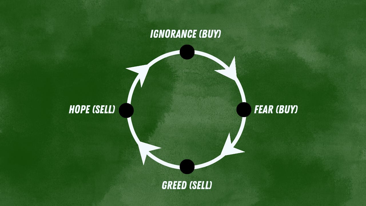 Throughout history, every new technology or industry goes through the same emotional cycle: Ignorance → Fear → Greed → Hope → and then back to Fear and Greed. Here’s how the cycle works: